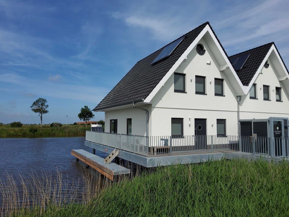 This stilt house is built on the Harle, directly opposite the marina and offers you a holiday of a very special kind. Enjoy the incomparable views and the extraordinary living atmosphere on the water. The semi-detached house has a terrace with private boat dock (completion 2. Half of the year) and a balcony and is located in the immediate vicinity of the Friedrichsschleuse, the Cliner source and the beach. Spend your holiday in an appealing ambience and take advantage of the numerous opportunities for recreation. Explore the region by bike, on foot or with the stand-up paddle board that is part of the holiday home. You have a car parking space and a garaging for your bikes available.