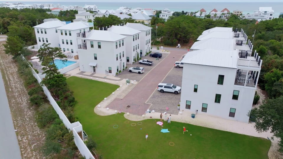This new neighborhood is being built out as an 11-house community that is themed to blend in with the new surrounding developments on the east end of 30A. Exteriors are white, hard-coat stucco with every house having unique shutter colors. Interiors have shaker cabinets, white quartz, professional kitchen appliances, nickel gap shiplap wall siding, built in bunks, hardwood floors, soft LED lighting, NEST Thermostats, and all the items you need to be comfortable during your stay such as a Dyson Animal cordless vacuum.