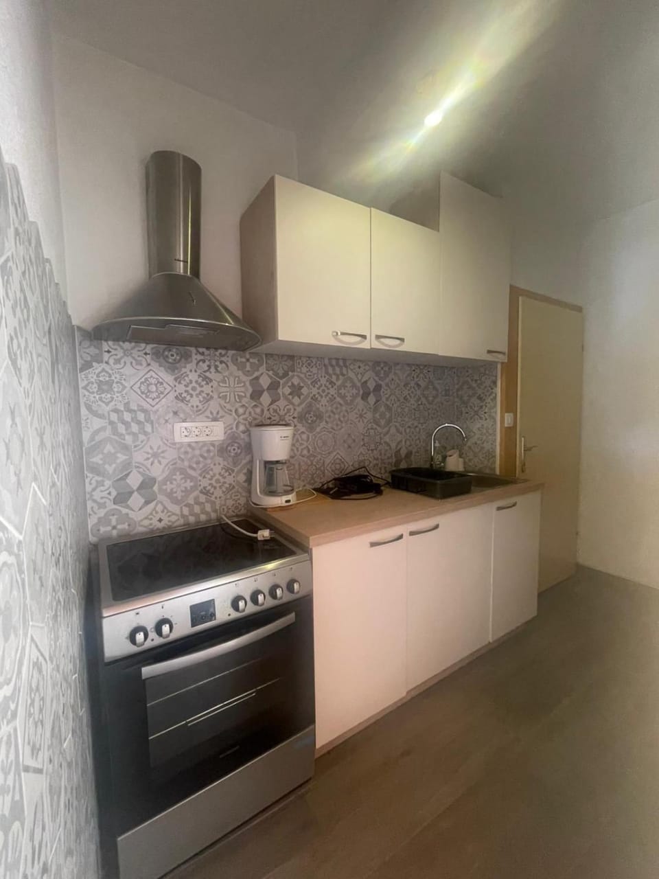 A konyhában nincs konnektor, a vízforralót a szobában kell bedugni. (A kávéfőzőt nem használtuk, de azt sem lehet a konyhában bedugni.)