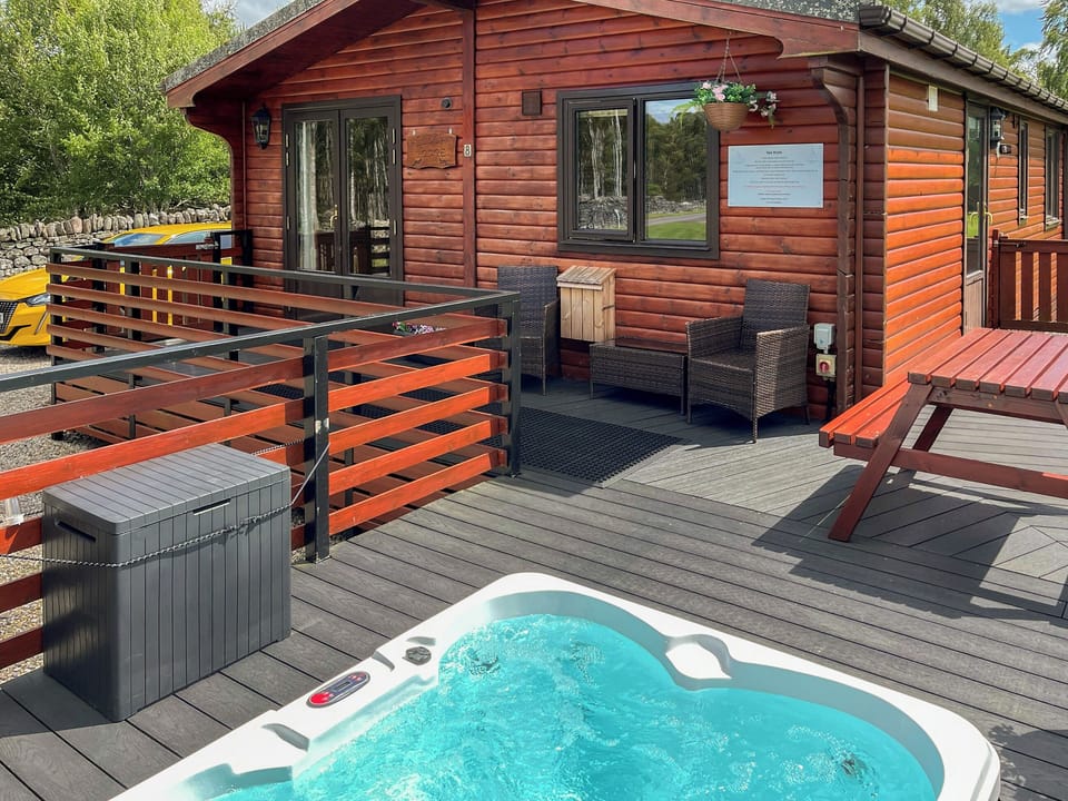 Bathroom: With shower cubicle, toilet and heated towel rail.. Electric central heating, electricity, gas, bed linen, towels, Wi-Fi and fuel for gas wood burner included. Travel cot and highchair. Welcome pack. Front garden with sitting out area (shared with other properties on-site). Hot tub for 4 (private). Children’s play area (shared with other properties on-site). Bike store. Private parking for 2 cars. No smoking.. Wildcat Lodge is a beautiful wooden lodge nestled in a quiet setting on the outskirts of Newtonmore and the heart of the Cairngorms National Park, offering a tranquil retreat for up to four guests. This charming two-bedroom lodge features a double and a twin room, a modern shower room, and an inviting fully stocked open-plan kitchen, dining, and living area with a log effect fire. Step outside onto the private decking to unwind in the hot tub after a day of walking, where you might spot red squirrels and a variety of birds, feeding from the squirrel and bird feeders just outside the Lodge.