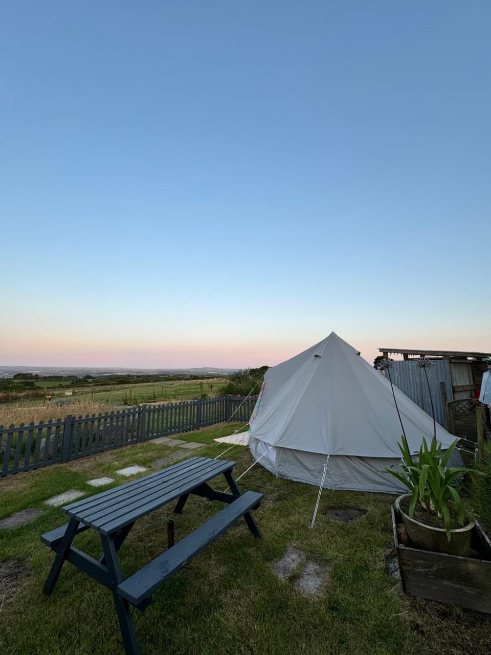 Super quirky, very clean, owners very helpful, fully equipped outdoor kitchen if required, the bell tent was really clean and cosy with the best view of the animals excellent views all round, campfire stuff provided with marshmallows had the best time
