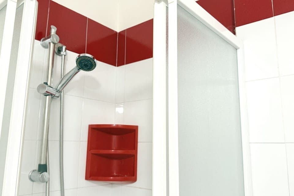 Description: Entrance into the living room with kitchenette featuring an induction cooktop, dining table, and double sofa bed – first bedroom with double bed – second bedroom with two single beds – full bathroom with shower box and washing machine.