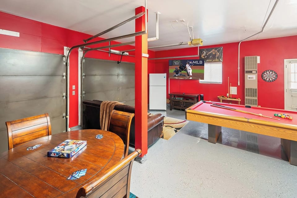 Make your way to the garage game/entertainment area. Here you will find a comfortable leather couch surrounding a large smart flat screen tv as well as a pool table, poker/cards table, dart board & arcade game console. The perfect area for a fun movie and game night for the kiddos! Also for your convenience during your stay enjoy high speed internet & Wifi as well as a laundry access with washer and dryer located in the garage.
