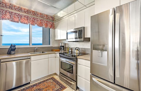 Directly next door, Suite 1001 is an equally impressive 1BR/2BA oceanfront suite offering a king bed in the primary bedroom, a queen sofa sleeper in the living room, and two full bathrooms. The fully equipped modern kitchen is stocked with everything needed for a comfortable stay, and a private washer and dryer add extra convenience.