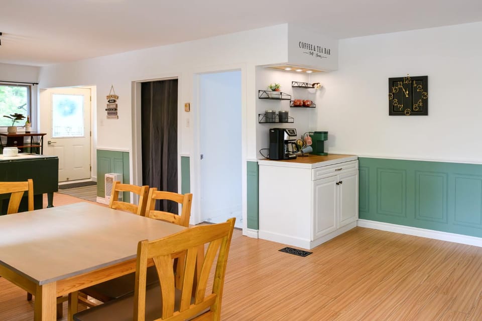 Logement spacieux et bien agencé. Nous avons apprécié passer du temps dans le basement, aménagé en salon avec poêle à bois, rocking-chairs et même un sapin ! Très joli décor et ambiance de Noël.
