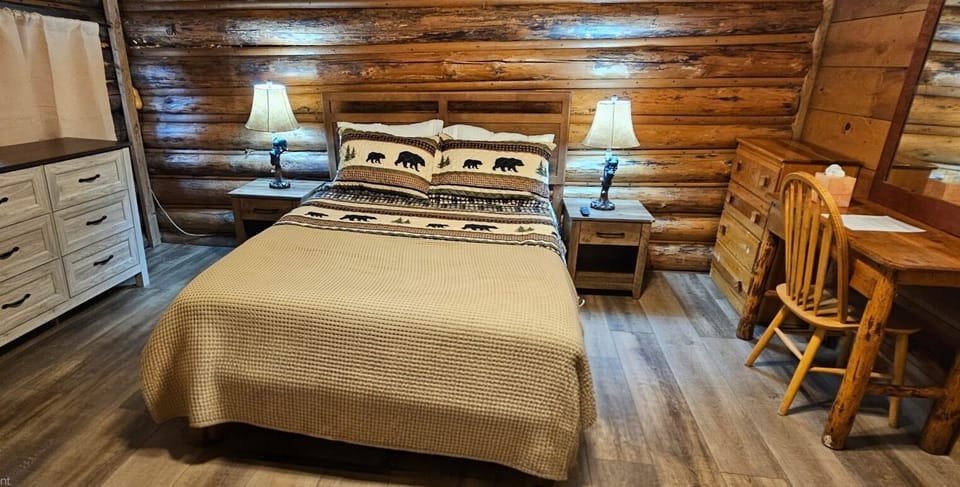 Our charming log cabin features a warm and inviting bedroom with a comfortable queen bed adorned with wildlife-themed bedding, ensuring a restful night's sleep. The wooden interior walls and floor exude rustic charm, creating an authentic mountain getaway atmosphere.