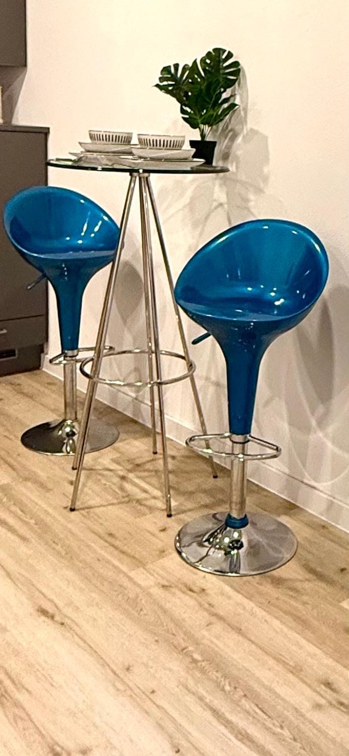 - unbequeme Barhocker mit Stehtisch zum Essen