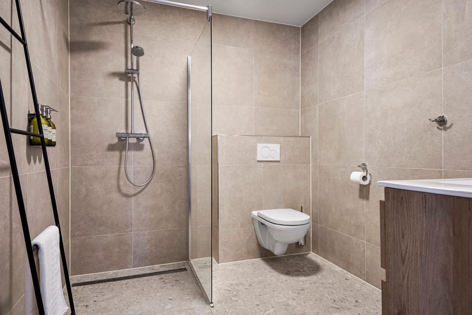 Voor de douche zouden wij een trekker adviseren om de vloer goed droog te maken. De douche zit wel dicht op het raam met de houten lamelen en die worden nat. De kar met vieze handdoeken is misschien niet zo handig bij de ingang.