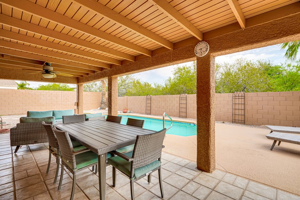 Yes, a swimming pool is available for use at 4 Mi to Catalina State Park: Mountain-View Home. Enjoy the water!