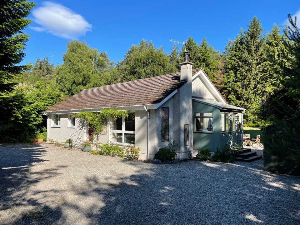 A gate from the garden opens directly onto woodland trails leading towards Loch Vaa, offering wonderful opportunities for walking, cycling, birdwatching, fishing, and even winter sports when the snow falls.