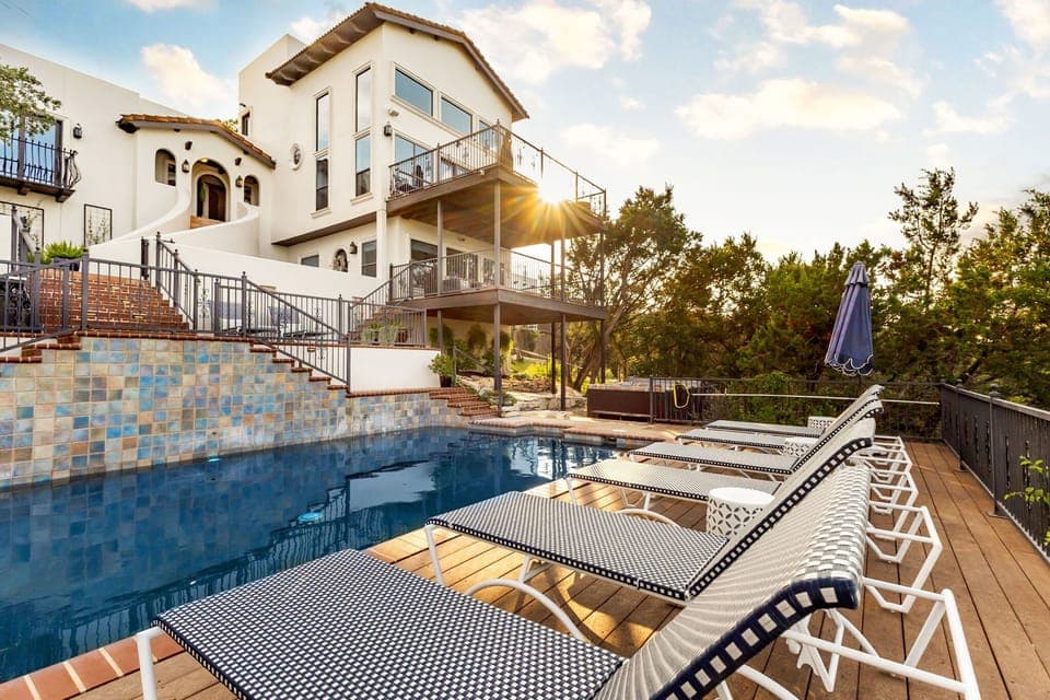 Welcome to La Casa Grande, a luxurious 3-bedroom, 3-bath Spanish-style retreat perched high above the Blanco River Valley. With soaring ceilings, elegant interiors, and sweeping hilltop views, this serene escape blends rustic charm with elevated comfort. Step outside to the pool and hot tub, unwind on the roof top patio, and savor breathtaking sunsets. Just minutes from Wimberley, yet worlds away in peace and privacy.