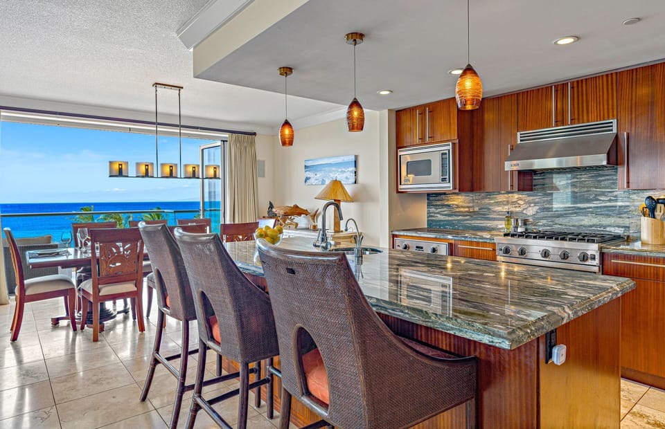 The combined 4400+ sq ft of interior living area provides ample room for family and friends to gather and reconnect, plus ample lanai space offers even more room to soak up the gorgeous Maui outdoors and take in the direct ocean views. The lanai of Hokulani 551 even has its own built-in Viking BBQ grill, offering the perfect setup for an outdoor group dinner.