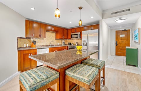 A few steps across the hall is Suite 930, which boasts one of the resort’s largest 1BR floor plans and sweeping views of the lush West Maui Mountains. Open the expansive glass doors to your private lanai and enjoy the frequent afternoon rainbows.