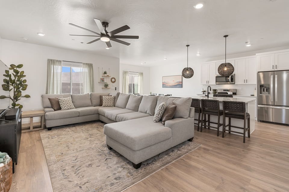 Welcome to Long Drive in Long Valley, a brand-new retreat in Washington, Utah, perfect for families and groups. This spacious home features 4 bedrooms, including three California King suites and a bunk room with 6 twin beds, plus a loft with a queen sofa sleeper and a Pack ’n Play for little ones. With a fully equipped kitchen and enclosed backyard, every detail is designed for comfort and convenience.