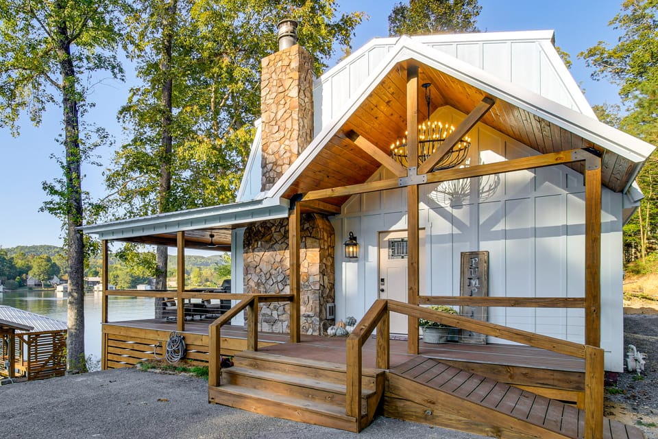 Golden leaves, glassy waters, and good times await at this 4-bed, 4.5-bath Scottsboro vacation rental! Mornings call for coffee on the deck and misty lake views, while afternoons are made for fishing under the autumn sky. Need a break from the boat? Trade your paddle for a flashlight and go bat-spotting in Cathedral Caverns, then return home for a movie on the big screen. The waves are calm, the fire is warm — all that’s missing is you.