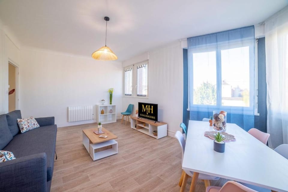 Agréable salon / salle à manger. Pas trop loin du centre de Bourges. A pied il faut compter 1/2h. Une boulangerie facilement accessible.