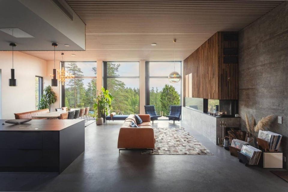 Pidin talosta paljon: se on moderni, sisustus on tyylikäs ja kokonaisuuteen sopiva, ja talossa on runsaasti muodikkaita huonekaluja. Sauna oli erityisen kaunis, ja suuret ikkunat tuovat varmasti kesällä upeat näkymät auringonlaskuun.