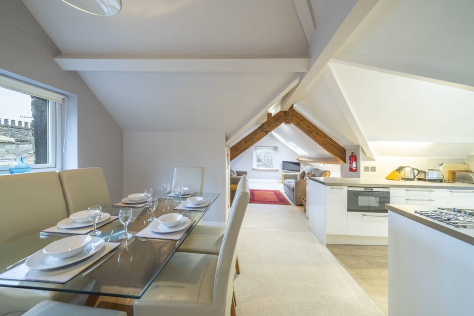 Step into the entrance area where there are coat hooks and the staircase up to the accommodation. The main living area is open-plan, making it a sociable space for all. The lounge area has two very good-sized sofas and a Freeview TV. The sleek and ultra-modern kitchen is very well thought out, with plenty of storage and worktop space, electric oven and hob, fridge, freezer (just off the kitchen), dishwasher, washer/ dryer, microwave, kettle, and toaster. If you fancy a break from cooking, you will be spoilt for choice with all sorts of cafe, restaurant, and pub options in Ambleside, including the ever-popular meal and movie deal at Zefirelli's Cinema and Restaurant.