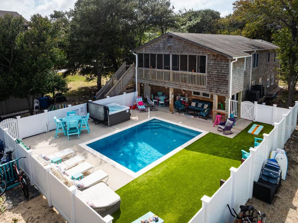 Indulge in a peaceful retreat at OCEANFRONT, Private Pool, Private Beach Access, Hot Tub, SSV124, Aint Life Grand, our elegant House in Duck. Enjoy amenities including Air conditioning, Dryer and Fireplace, and more.