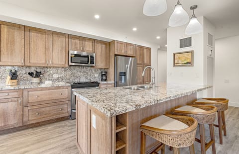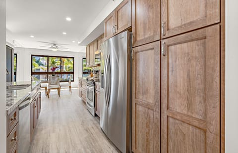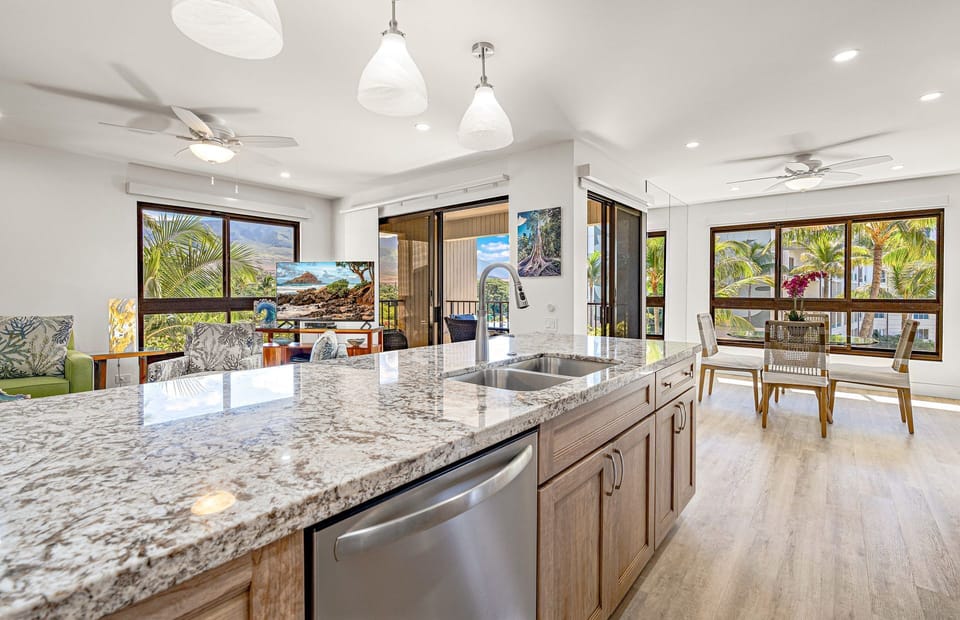 Both bathrooms have been transformed into spa-inspired retreats, featuring modern finishes and elegant details. The fully equipped kitchen inspires culinary creativity, while the dining area provides a stunning backdrop of views stretching from the mountains to the sea. Savor your meals in the cool comfort of air conditioning or dine al fresco on the lanai while enjoying Maui’s beauty from sunrise to sunset.
