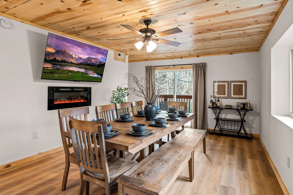 Step foot into the large dining area as you first enter the home. Our large, rustic dining table comfortably fits 10, with additional bar-height seating available in the nook and kitchen. Enjoy a home-cooked meal with the entire group, taking in the ambiance provided by the electric fireplace mounted to the wall. A large Roku Smart TV means you'll never miss a big play as you cheer on your favorite team or catch up on some shows.