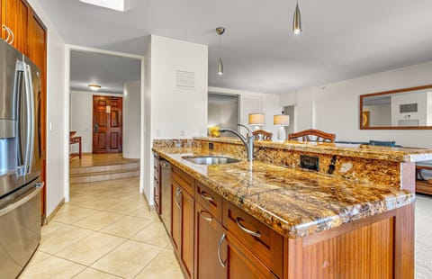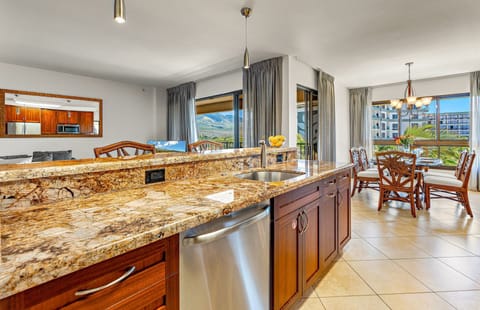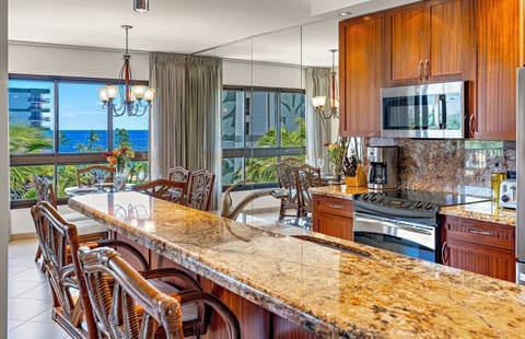 The gourmet kitchen is beautifully designed with modern cabinetry, granite countertops, and stainless steel appliances. Fully equipped with everything needed to prepare delicious meals, guests can dine in air-conditioned comfort while overlooking the turquoise-blue waters of Kaanapali Beach or step out onto the lanai to savor each meal in the refreshing Maui breeze.