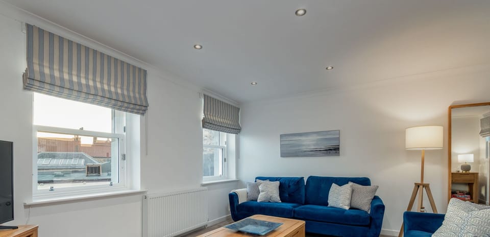 The light filled living room is made for slow mornings and cosy evenings, with deep sofas, a Smart TV and glimpses towards the Firth of Forth.