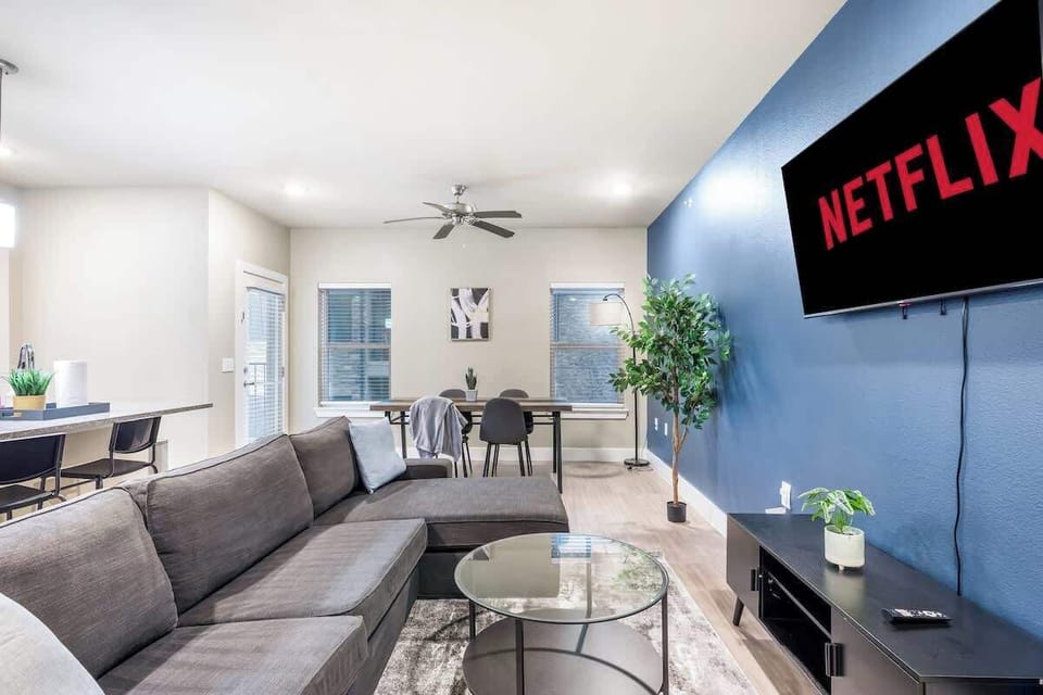 • Living Room: The living room is adorned with a 3-seat sectional with reversible chaise. Perfect for relaxing and enjoying good company while watching a movie or TV show. It also includes a 55” 4K UHD Smart TV, a coffee table, and high-speed Wi-Fi.