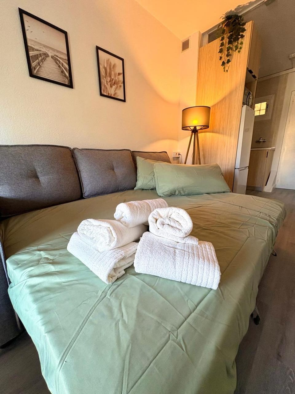 What amenities are available at Bonito estudio con terraza, cerca de la playa?