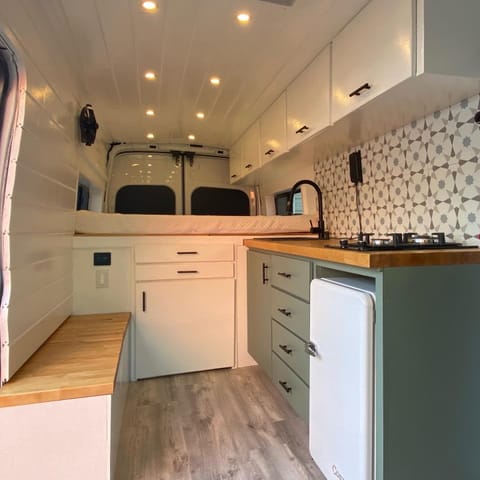 This is a high roof van so you can stand upright (up to 6'2") to cook dinner on the double-burner gas stove. The interior space is flexible, featuring a slide-out dining table, driver and passenger swivel seats, and a tucked away composting toilet. Daisy's function and style meet in the kitchen; there's a charming refrigerator, posh backsplash, ample counter space, and all the essentials packed ready to cook up a feast!