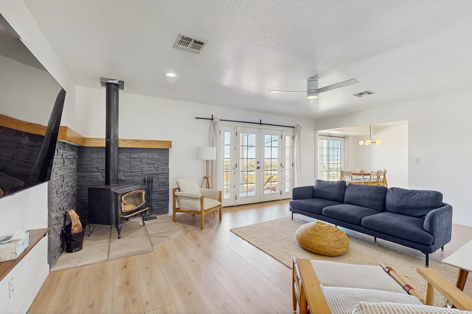 Nestled just a five-minute drive from the west entrance of Joshua Tree National Park, this stunning house offers an unparalleled escape into nature with incredible views of North Joshua Tree. Imagine soaking in the beauty of the desert landscape from your own pool, or enjoying a peaceful evening by the fire pit on the spacious patio. This home is designed for relaxation and adventure, making it the perfect getaway for families, couples, or friends.