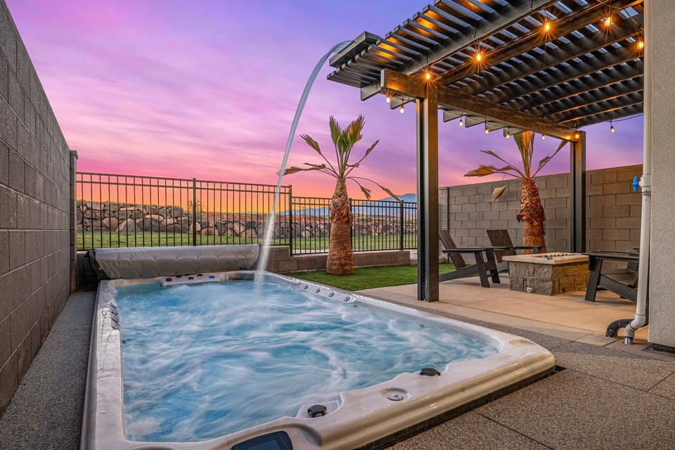 The open-concept living area is warm and inviting, with plush seating and sleek décor that flows into a fully equipped kitchen, perfect for cooking group dinners or fueling up before your next desert adventure. Outside, your private backyard paradise awaits! Roast marshmallows around the fire pit, take a dip in the swim spa, or fire up the grill for a sunset barbecue under the glowing Southern Utah sky. The fun continues in the garage game zone, complete with a ping pong table, dart board, Pac-Man arcade table, shuffleboard, and even a wagon cooler for easy outdoor refreshment. We've also stocked the garage with pickleball gear, sports equipment, and an EV charger for your convenience. Traveling with little ones? We've got you covered with a baby gate for the stairs and thoughtful touches throughout to make your stay worry-free. Plus, gamers will love the PlayStation 5 with extra attachments, perfect for a little friendly competition! Located just minutes from Sand Hollow Reservoir and a short drive from world-class hiking, ATV trails, golf courses, and Zion National Park, this home is the ultimate blend of relaxation and adventure. Book your stay today and experience the best of Southern Utah, where comfort meets excitement, and every day ends with a glowing desert sunset.