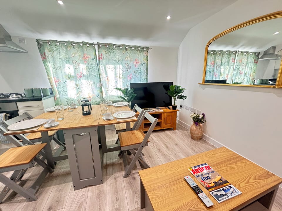 The kitchen is fully fitted with all essentials, including an oven, hob, fridge-freezer, microwave, toaster, kettle, cookware, and dining space — making it easy for guests to prepare meals during longer stays.