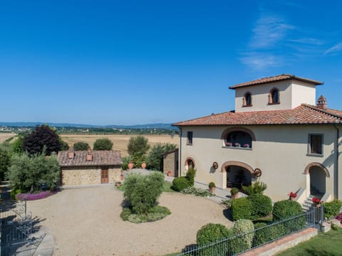 Villa Leopoldina, immersed in a wide Italian-style meadow with a breathtaking view on the countryside and the surrounding hills, is a splendid sample of Tuscan rural architecture, dating back to the reclamation of the Valdichiana, established in the 18th Century by Granduca Leopoldo di Lorena, after who the architectural style and the villa itself are named.The whole complex, which hosts a chapel still consacrated, has been recently restored according to the new "green" philosphy that provided it with a photovoltaic system designed to guarantee the independence from the energetic point of view. Building materials, pieces of furniture and accessories in contemporary style make this villa a modern and elegant place: welcoming and comfortable, yet maintaining the authentic "taste" of the beautiful and majestic structure, untouched by time.The stone farmhouse: LeopoldinaThe ground floor boasts a spacious and elegant living room with stone fireplace and sitting area with sofas and satellite TV; magnificent dining room with large table ideal for groups up to 16 people; adjacent modern kitchen equipped with central island and up-to-date cooking devices. The floor is completed by a double bedroom with private bathroom, another bathroom with shower and laundry area. The first floor, used as sleeping area just like in the past, is accessible by both inner and outer staircase, the latter covered by a loggia. It is composed of two double bedrooms with private bathroom and two additional bedrooms, a double and a triple one, sharing a full bathroom with shower. In the Torre colombaia (the very top part of the house), which is another distinguishing feature of the Leopoldina architecture, there is a romantic double bedroom with private bathroom. Finally a triple bedroom with bathroom is located in the lovely stone annex.Garden and Pool:Inside the wide garden, guests can find the BBQ area, equipped with oven and grills; a gazebo where to enjoy al fresco meals overwhelmed by the smell of jasmine bushes and experience romantic sunsets in this part of countryside. The pool, equipped with solarium area and sunbeds can be reached both through the lovely staircase and the grassy ramp. Under the outer loggia it is possible to find a shadowed area with sofas and table where to eat open-air and an additional covered area equipped with kitchenette, fridge, sofas, TV, bathroom and dressing room. Villa Leopoldina is the perfect place for those who are looking for a relaxing though high quality holiday. The city centre is located just 10km away: there one can find services, museums, churches, monuments that worth a visit. Upon arrival, guests will be welcomed with a welcome basket with breakfast products.Short description 1Number of kitchens : 1SurroundingNearby sports facilities : Bike tours, Golf course, Indoor riding arena, Mountainbiking, Riding possibilitiesGarden and outdoorGarden facilities : Garden furniture provided, GrillOn-site leisure facilities : Outdoor swimming pool exclusive use, Solarium, Swimming poolService benefitsService facilities (may incur additional costs) : Breakfast, Chambermaid, Cleaning service during your stay, Cook, Shopping service before arrival