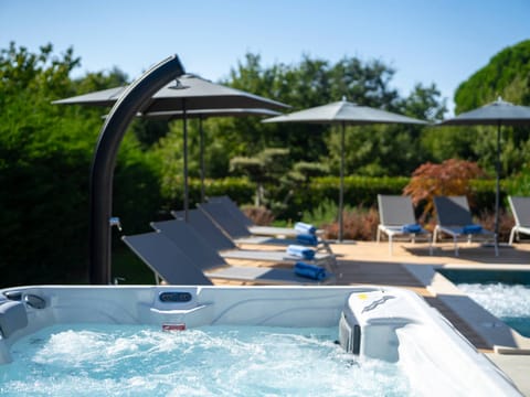 On the fenced and well-kept plot of 950 m² there is a 40 m² infinity pool with a hydromassage corner, jacuzzi, 10 sun loungers, three parasols, an outdoor kitchen with gas barbecue and fridge, a covered terrace with seating and a dining table, children's playground, table tennis and 3 parking spaces.