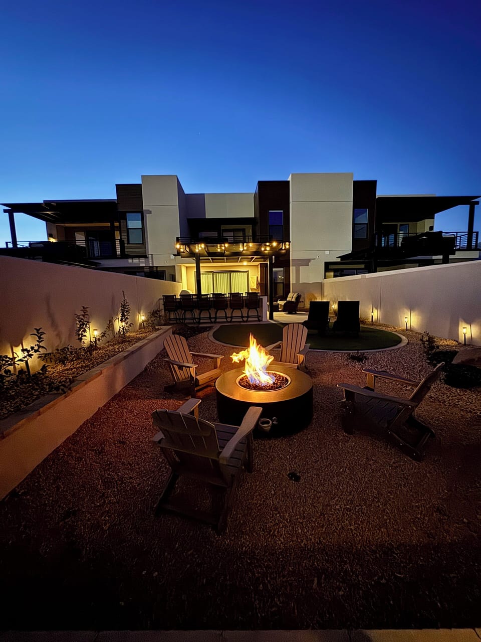 Private back yard at night. Fire pit area shown.
