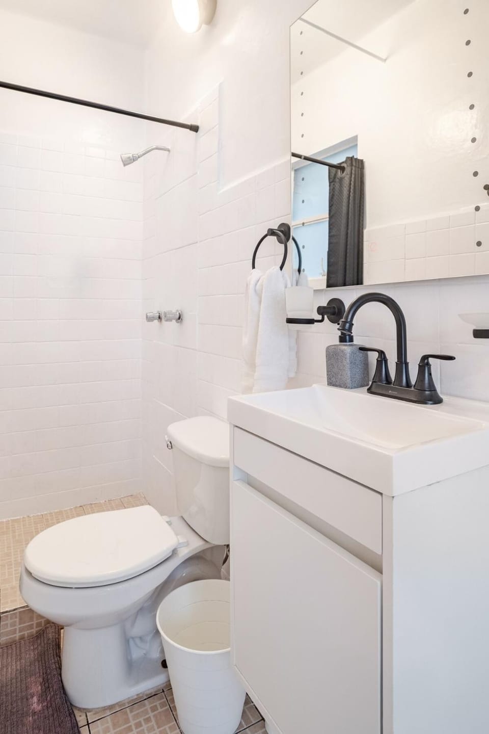 The bathroom is tiny--my knees touched the opposite wall when I sat on the toilet, and I'm not very tall (177cm = 5'10"). Every time the toilet flushes, a trickle of water seeps along the floor and pools in a corner near the shower and where your feet would be if you sit on the toilet.