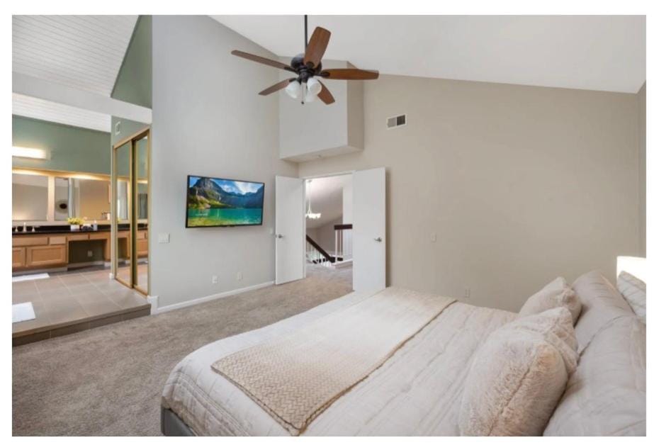 Indulge in a peaceful retreat at This is a bedroom with a private bathroom in a 3 bedroom home, our elegant House in Laguna Hills. Enjoy amenities including Air conditioning, Fireplace and Kitchen, and more.