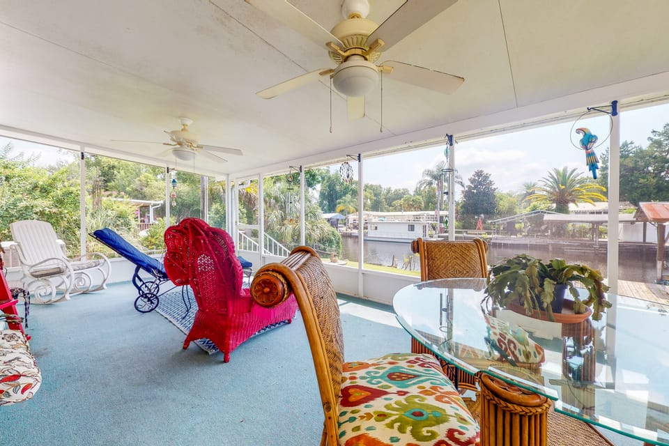 Directly on a canal flowing from the St. Johns River, this amazing home offers a quiet waterfront getaway. Walk right out your back door and down the steps to access the private covered boat dock. Tie up your rig (there’s a public boat launch down the road), cast a line off the fishing deck, and keep an eye out for the small alligators that pop by occasionally.
