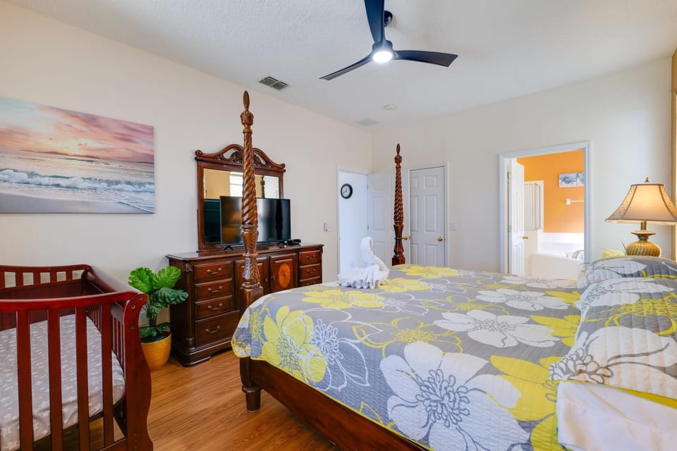 Indulge in a peaceful retreat at Luxury 6-Bedroom Villa with Private Pool & near Disney, our elegant House in Four Corners. Enjoy amenities including Free Parking, Gym and Golf course (within 2 mi), and more.