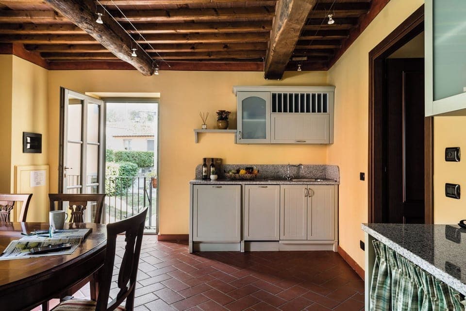 The Deluxe apartment, once an old warehouse of the Estate, is now a loft on 2 levels that can accommodate up to 8 people. On the ground floor we find the comfortable living and dining room, the fully equipped country-style kitchen, the double bedroom with breathtaking views of the Lucca valley, the second bedroom with two single beds and the bathroom with shower. Upstairs, an open space with a king bed, sofa bed and a bathroom with bathtub. Private garden.