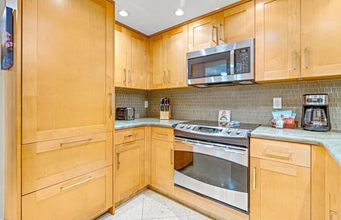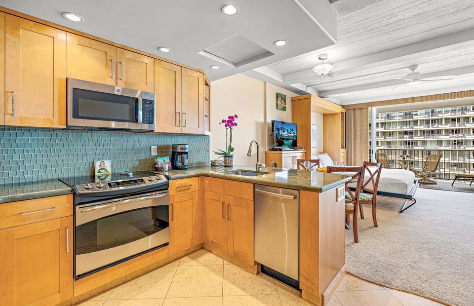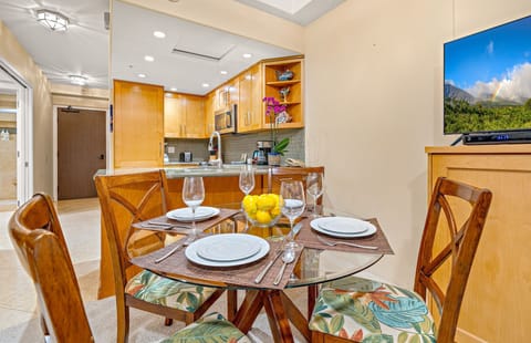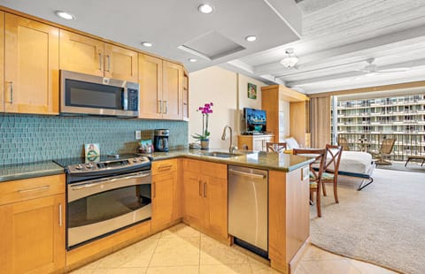 The full kitchen is outfitted with stainless steel appliances and is fully stocked with all the cookware and utensils needed for an effortless dining experience. Enjoy meals on the private lanai overlooking the Pacific Ocean, resort grounds, and tranquil pool, or dine indoors in the cool comfort of the air-conditioned dining area.