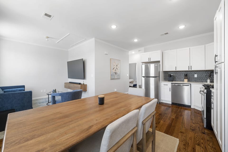 Welcome to your urban elegance in Jersey City! This spacious and modern apartment, designed to accommodate up to 6 people, is perfect for families seeking a comfortable and stylish retreat. With its wood accents and soothing blue tones, it offers a calming ambiance after a day of exploring the vibrant energy of nearby NYC. Situated just a few steps away from public transportation, you'll have easy access to all the attractions the city has to offer.