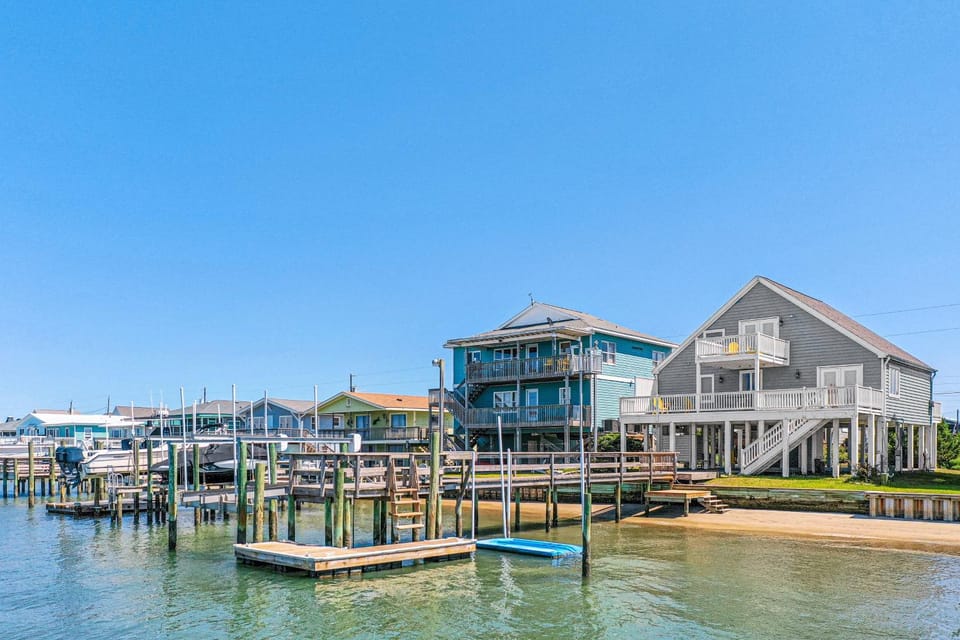 Experience vacation in Topsail Beach with our House, Soundfront 4BR with Private Dock & Beach & Elevator. Walk to Town. Enjoy amenities such as Air conditioning, Balcony/Terrace and Dryer, and more.