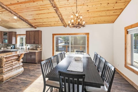 Golden View Cabin offers a welcoming main living space where everyone can gather comfortably. Vaulted pine ceilings and exposed log beams create a true mountain atmosphere, while modern furnishings and climate control ensure comfort in every season.