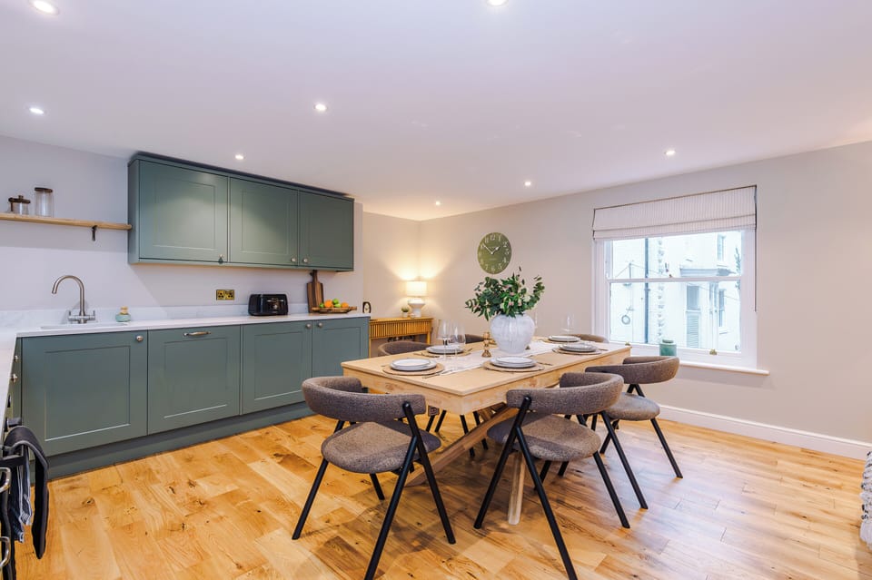 Guests enter on the ground floor into a private hallway before ascending to the first floor, where a bespoke, high-end kitchen and dining space awaits. Designed for both style and function, this light-filled room enjoys views towards the cathedral and provides the perfect setting for leisurely breakfasts or intimate evenings.