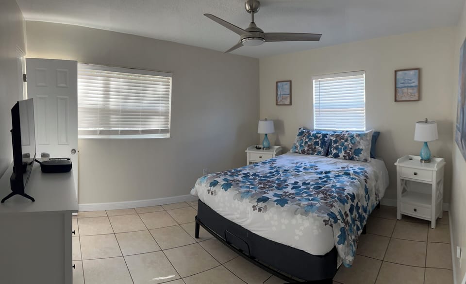 Inside, the home feels fresh, open, and thoughtfully designed. The living space is bright and inviting, ideal for unwinding after a day out, while the fully equipped kitchen makes it easy to enjoy everything from quick breakfasts to family-style dinners. The home sleeps up to 6 guests with a flexible bedroom layout, comfortable beds, ceiling fans throughout, and central air to keep things cool year-round.