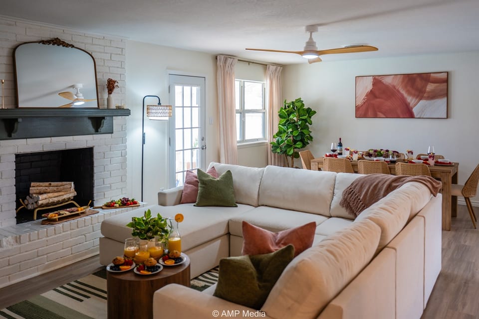 Step inside to an open, airy main living space anchored by an oversized sectional sofa, painted brick fireplace, and warm earthy tones throughout. The fully equipped kitchen makes meal prep effortless, complete with quartz counters, subway tile backsplash, and a snack basket to kick off your stay right. The formal dining room seats 8+ and opens toward the backyard — perfect for group dinners before a night out.