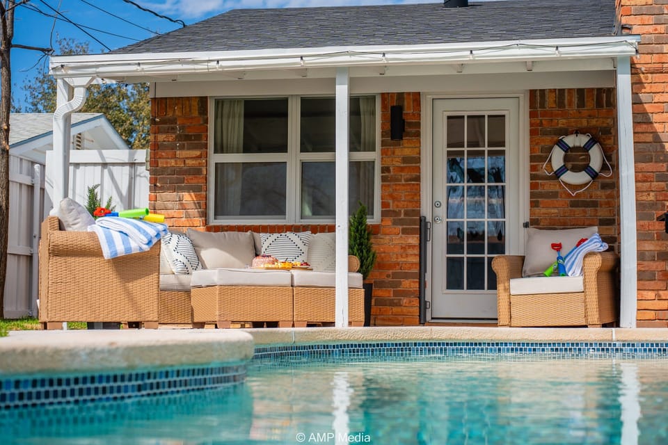 A covered patio with wicker lounge furniture provides a shaded retreat for afternoon hangs, while string lights set the mood after dark. A grill is on-site and ready for your cookout. Pool toys, floats, and beach towels are stocked in the dedicated pool closet so you can jump in without a second thought.