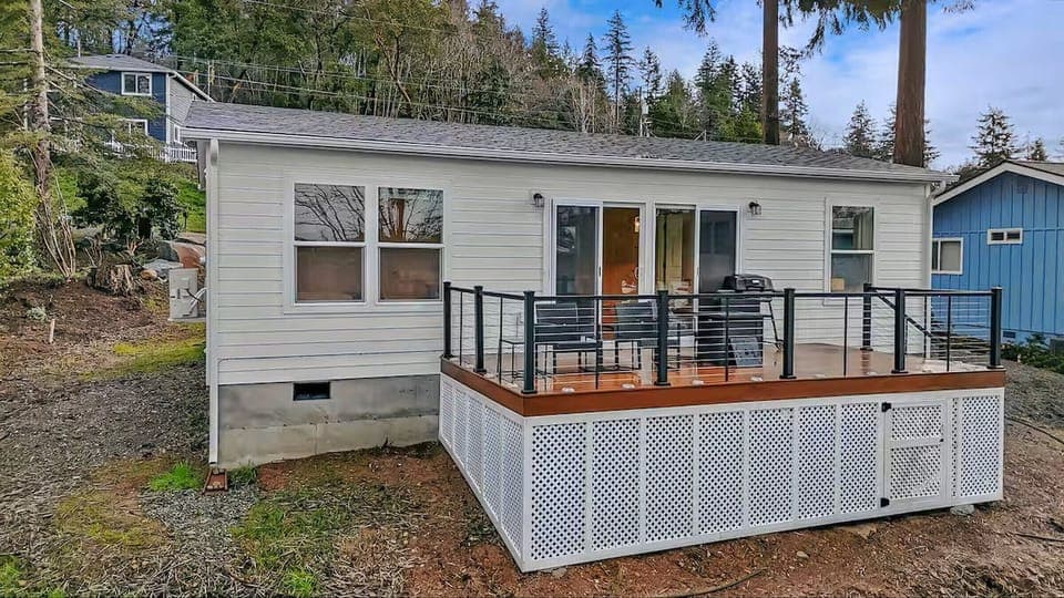 This light-filled, modern cabin features expansive windows and gorgeous waterfront views from every main living space. Nestled in a quiet neighborhood with minimal traffic, the home offers a peaceful setting where you can fully unwind and enjoy the sounds of nature.